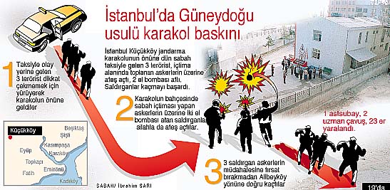 İstanbul Gaziosmanpaşa Küçükköy Jandarma Karakolu, dün sabah saat 08.00 sıralarında, üç terörist tarafından bomba atıldıktan sonra silahla tarandı. Olayda sabah içtimasında bulunan askerlerden 16'sı çok hafif olmak üzere 26'sı yaralandı. Şarapnel parçalarıyla yaralanan askerlerin hayati tehlikesinin bulunmadığı açıklandı.