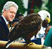 BASIN toplantısı sırasında Clinton'ı önce uysal uysal dinleyen dev kartal, sıra birlikte fotoğraf çektirmeye gelince Başkan'a doğru bir hamle yaptı. Clinton da refleksle geriye sıçrayınca toplantıyı izleyenler kahkahaya boğuldu. Kel kartal, vahşi bir hayvan olmasına karşın insanlara dostça yaklaşmasıyla da tanınıyor. Kartalların sayısı Amerika'da geçen yüzyıl 500 binken, 1960'larda birkaç bine düşmüş, bunun üzerine korumaya alınmışlardı.