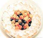 Unu ve şekeri bir kapta karıştıralım. Damla sakızını un haline getirelim. Sütü ekleyelim. Sürekli karıştırarak üzeri göz göz olana dek pişirelim. Pandispanyayı ortadan ikiye keselim. Pandispanyanın iç kısımını limonlu su ile hafifçe ıslatalım. Sonra diğer katın iç kısmını ıslatalım. Kremayı ateşten alıp, iyice soğutalım. İçine margarini eritmeden ilave edelim. Mikserle köpük köpük olana dek çırpalım. Pastanın alt kısmının üzerine kremayı sürelim. Üzerine meyve dilimlerini dizelim. İkinci katı üzerine kapatalım. Kalan kremayı pastanın üzerine sürelim. Tekrar meyve dilimleri ile süsleyelim. Kalan kremayı pastanın yanlarına ve üzerine sürelim. Meyve dilimleri ile süsleyelim. Buzdolabının uygun bir rafında birkaç saat bekletelim. Dilimleyerek, servis yapalım.