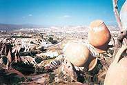 Erciyes'in etekleri bir tarafta bereketli buğday tarlalarıyla kucaklaşıp sonsuz ufuklara doğru uzanırken, bir tarafta bu dünyanın başka hiçbir yerinde rastlanmayacak kadar oyuncaklı bir yerel şekillenme içindeydi. Avanos'u geçip de Göreme'ye doğru döner dönmez ağzımız bir karış açık kalmıştı gördüklerimiz karşısında. Tepesi şapkalı, mantarımsı peri bacaları, tüf kayalar içine oyulmuş karınca yuvası gibi binlerce mağara...