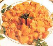 Ön hazırlık olarak soğanları küçük küçük doğrayalım. Yağı eritelim. Soğanları sararana dek kavuralım. Tavuk etini kuşbaşı iriliğinde doğrayıp, tencereye alalım. Tavuk etinin rengi değişip, hafifçe yumuşayana dek kavuralım. Domatesin kabuğunu fındık iriliğinde doğrayarak, ilave edelim. Domates ve biber salçasını ekleyip, kavurmaya devam edelim. Sivri biberleri üçe kesip, tencereye alalım. İki dakika daha kavurup, malzemelerin üzerine iki parmak çıkacak kadar su ve haşlanmış nohutları ilave edelim. Tuzunu ve biberini ayarlayıp, kısık ateşte etler yumuşayana dek pişirelim. Patates püresi eşliğinde servis yapalım.