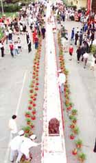 50'nci Yıl Kutlamalarına büyük önem veren Komünist Parti, bir emirle bütün yerel teşkilatlara yıldönümü kutlamalarının en eğlenceli ve gösterişli bir şekilde geçmesi için direktif vermiş durumda. Bu çerçevede kutlamalar için Çin'de dünyanın en uzun pastası pişirildi. 24 Çinli pasta ustasının kesintisiz iki gün çalışıp, 300 kilo un, 5 bin 800 yumurta, 120 kilo çeşitli meyveler, 450 litre krema ve 350 kilo şeker kullanarak yaptığı 51 metre uzunluğunda ve 1675 kilo ağırlığındaki dev pastadan tam 5 bin porsiyon çıkması bekleniyor. Pastanın yapımını dün başarıyla tamamlayan ve bu arada Guinnes Rekorlar kitabına girmeye de hak kazan ustalar ödüllendirilecek...