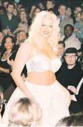 Eski Playboy güzeli Anna Nicole Smith yine podyumlarda. Gerçi petrol zengini kocası J. Howard Marshall'ın tansiyonunu yükselttiği günlere oranla biraz kilolanmış gibi görünüyor ama yine de podyumlarda kendisine yer buluyor. Smith geçtiğimiz günlerde New York'ta birbirinden ünlü ve ilginç modellerin yer aldığı bir defilede büyük beden iç çamaşırlarını sundu. "Cacique" sütyenleri defilesinde 33 yaşındaki Smith'in yanı sıra Jack Nicholson'ın kızı Jennifer ve Aerosmith grubunun solisti Steve Tyler'ın kızı Mia Tyler da sahnedeydi. Anna petrol zengini ihtiyar J. Howard Marshall'la evliliğiyle gündeme gelmişti. Kocası iri göğüslerin heyecanına çok dayanamamış kısa zaman sonra kalpten gitmişti. Smith ile zengin petrolcünün oğru arasındaki miras kavgası ise hala sürüyor.