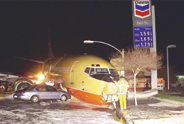 OLAY, trafiğin yoğun olmadığı bir saate rastladığı için uçak, biri park, biri ise seyir halinde 2 otomobile çarptı. Seyir halindeki otomobilde bulunan bir kadın ve çocuk kazayı yara almadan atlattı. Altı şeritli otoyolu diklemesine geçen uçak, bu kez hızla yol kenarındaki benzin istasyonuna yöneldi. Ancak mucize eseri dev uçak, benzin istasyonunun duvarına sadece bir metre kala durmayı başardı. Büyük bir faciaya dönüşebilecek kaza sonrasında pilot ve iki yolcuda hafif sıyrıklar olduğu açıklandı.