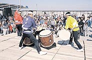 Meydanda kurulan platformda, kırmızı, sarı ve siyah giysileriyle 3 Japon genci yerini alıp, bir de dev davullarının başına geçti. Japon Davul Grubu Tachibana Taiko Hibikiza, "vadaiko" olarak isimlendirilen davullarıyla bir saat süren bir gösteri yaptılar. Çocuk gülüşlerine davul gümbürtüleri de karışınca Türk-Japon Köyü tam bir "Bayram yeri"ne döndü. Davul şovu merakla izleyenler hiç kuşkusuz çocuklardı. Japon davulcuların her hareketini ilgi ve beğeniyle izleyen çocuklar, sevinç çığlıklarıyla şova ayrı bir hava kattılar. Japon davulcular da, 3 depremzede çocuğu platforma davet edip, şovlarına onlarla birlikte devam ettiler.