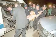 Polislere direnen travestilerden biri yanındaki maket bıçağıyla kendisini kesmeye kalkınca ortalık bir anda kan gölüne döndü. Polis, "Sevda" takma isimli travestinin birdenbire üzerindekileri atıp soyunmaya ve elindeki maket bıçağıyla vücudunu kesmeye başlaması üzerine müdahale etmek istedi. Ancak bu uzun süre başarılamadı. Hayli uğraştan sonra polis otosuna bindirilen Sevda, bu kez aracın camından kaçmaya çalıştı. Travestiler ellerinden kelepçelenerek karakola götürüldü. Travestilerin kavgasını görüntülemek isteyen iki özel televizyonun kameramanı da travestilerin hışmına uğradı. Görüntü almaya çalışan kameramanlara saldırıp kameralarına büyük ölçüde hasar verdiler.