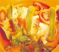 KABAKLARI soyun. Tuzlu suda haşlayın. Daha sonra, ortadan ikiye kesin. Üzerine ince uzun şekil verdiğiniz peynirleri ve dilimlediğiniz domatesleri dizin. 200 derecelik fırında 10 dakika kadar pişirin.