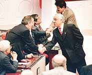 MHP'li Devlet Bakanı Sadi Somuncuoğlu, dün tam bir koruma ordusuyla Meclis'e geldi. 40'a yakın koruma ordusunun oluşturduğu koridor ile Meclis kulisine giren Somuncuoğlu, kendisi gibi cumhurbaşkanı adayı olan Meclis Başkanı Yıldırım Akbulut ile el sıkıştı. Akbulut, Somuncuoğlu'na "Geçmiş olsun" dedi. MHP'lilerden Bahçeli dahil kimsenin yüzüne bile bakmadığı Somuncuoğlu, tek başına oturdu. Somuncuoğlu, bir gerginliğe nedenolmamak için sonuçları evinden izledi.