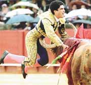 İSPANYA'DA boğa güreşlerinin, geleneksel hale gelen görüntülerinden biri de boğaların gazabına uğrayan matadorlar... Son ayların en yetenekli matadorları arasında gösterilen Emilio Munoz da ne yazık ki bu korkunç manzaralardan birinin baş kahramanı oldu. Munoz, İspanya'nın güneyindeki Sevilla kentinde yapılan boğa güreşlerinde alkışlar arasında arenaya çıktı. Başlangıçta her şey yolunda gidiyordu. Munoz mızrağını boğaya art arda saplıyordu. Ancak bir anlık dalgınlığı ona pahalıya patladı. Munoz, bir anda boğanın boynuzlarını midesinde hissetti.