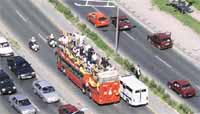 Danimarka'da tarih yazan Galatasaraylı futbolcular, uçaktan iner inmez üzeri açık otobüsle İstanbul turuna çıkıp, kendilerini bekleyen taraftarlarıyla kucaklaştı