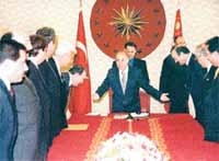 Cumhurbaşkanı Ahmet Necdet Sezer, dün TBMM Başkanı Yıldırım Akbulut ile 19 kişiden oluşan TBMM Başkanlık Divanı üyelerini kabul etti. Basına kapalı yapılan ve bir saat süren görüşmede önemli mesajlar veren Sezer, 12 Eylül döneminde uygulamaya konulan Anayasa'nın değiştirilmesi gerektiğini belirtti. Sezer, "1982 Anayasası'nın bugünkü koşullarla çelişen birçok maddesi var. Bence Anayasa değişikliği, yasa değişikliklerinden daha önemli. Anayasa'yı değiştirin. Bir ay hızlı çalışıp bunu başarırsınız. Sonra da tatil hakkınız. Zaten çok verimli çalışıyorsunuz" dedi.