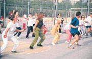 70 kişilik grubun "genç" sporcularından 62 yaşındaki Türkan Karademirci ise, "Her sabat 5'te kalkıyorum. Buraya koşa-koşa geliyorum, çok da iyi yapıyorum" diyor.