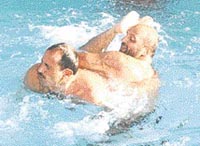 Samandıra'nın güreş ustası Belediye Başkanı Abdullah Bayram mücadelesini her satıhta sürdürüyor. Rakiplerini minderde, çayırda kündeye getirmesiyle tanınan Bayram serinlemek için girdiği havuzda da güreş tutuyor.