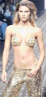 2001 İlkbahar'Yaz koleksiyonlarında altın ışıltılarını bol bol kullanan modacılar, plaj kıyafetlerine bile birer gece elbisesi görünümü kazandırıyor. İtalyanlar'ın seksi sunucusu Martina Colombari'nin tanıttığı "bikini set" de altın tasarımlar zincirinin oldukça hoş bir halkası. Üç parçadan oluşan takım, plajlardan çok, jet set üyesi cesur bayanların görkemli davetlerde giymesi için tasarlanmış.