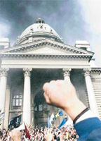 Yugoslavya'da seçim yenilgisini kabul etmeyen Miloseviç'i indirmeye kararlı halk, parlamento binasını ele geçirdi ve mesaj verdi: Öleceksin!