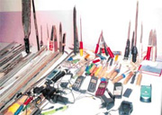 " 1 eğe, toplam 169 kesici-delici alet, 8 telefon adaptörü, 5 metre düğümlenmiş nevresim, 30 santimlik bir şiş, 2'si sustalı toplam 3 bıçak, 7 cep telefonu, 43 uyuşturucu hap, 1 satır, 3 litre kendi imalatları olan şarap."
