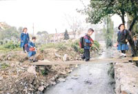 1000'i aşkın küçük öğrenci okula gitmek için mikrop deresinin üstündeki ince kalasın üstünden geçiyor