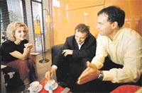 Buluşma yerimiz olan Buz Bar'a girdikleri anda hangisinin pilot (arabayı kullanan), hangisinin co-pilot (sürücünün yanında oturarak direktifleri veren) olduğunu anlamakta hiç güçlük çekmedim. Co-pilot Erkan Bodur'un oldukça munis bir yüzü, pilot Serkan Yazacı'nın ise hani derler ya, fel fecir okuyan gözleri vardı. Tahminimi söyledim, doğrulandı.