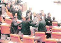 Meclis Genel Kurulu'nda devam eden bütçe görüşmelerinde FP'li milletvekilleri ile MHP'li vekiller birbirine girdi. Başkent sokaklarında yaşanan kavga görüntüleri gecenin ilerleyen saatlerinde Meclis Genel Kurulu'na taşındı. FP Tokat Milletvekili Bekir Sobacı'nın, hükümeti eleştirirken kullandığı, "Küstah ve saldırgansınız" sözleri MHP'lileri çileden çıkarırken yerlerinden kalkan MHP'lilerle FP'li vekiller birbirlerine girdi. Oturumu yöneten Meclis Başkan vekili Ali Ilıksoy, küfürlerin ve tehditlerin savrulduğu tartışmaları oturuma ara vererek durdurabildi.