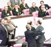 Önceki geceyi FP'li ve MHP'li vekillerin küfürlü ve tehditli kavgasıyla tamamlayan Meclis Genel Kurulu'nda dün de DYP ve DSP'li vekiller birbirine girdi. Kavga DYP Van Milletvekili Fethullah Gültepe'nin Ecevit'e yönelik "Sağlıksız, yorgun, bitkin" şeklindeki ithamlarından çıktı.