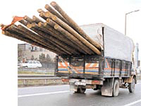 "Trafik canavarı" kavramını en çarpıcı şekilde simgeleyen tahta direklerle salkım saçak yüklü kamyon TEM'i boydan boya katederken polis uyudu. Bir tek Trafik ekibi görülmedi...