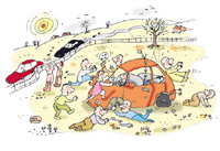 Öte yandan otoyol kenarında vaziyet giderek daha da heyecanlı bir hal alıyordu. Yüksek protein kaynağının, dikenli telin bu yakasına geçmesi saatlerce kıpırdamadan uzaklardaki şehirlere bakan ihtiyarları bile hareketlendirmişti. Hatta çoktan hurdaya dönüşmüş eski arabalar sanki nikelajları bir nevi hayat kazanıyormuş gibi güneş altında parlamaya başlamıştı.