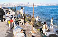 Bazı küçükler, pırıl pırıl güneşin ortalığı bütün gücüyle ısıttığını görünce denize koştu. Sarayburnu'nda denize giren küçüklerin görüntüsü İstanbullular'a yaz günlerinin coşkusunu hatırlattı.