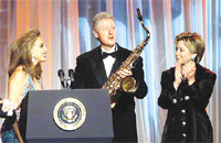 Lise yıllarında saksafon çalmaya başlayan Clinton, 8 yıllık başkanlık dönemi boyunca da her fırsatta saksafonuyla kameraların karşısına çıktı. NBC televizyonundaki Jay Leno Show ve The Arsenio Hall Show gibi programlara katılarak sololar yaptı. Çek Cumhuriyeti gezisinde de Cumhurbaşkanı Vaclav Havel ile bir gece kulübünde sahneye çıktı. Clinton'ın saksafonu seks skandallarında bile başrolü oynadı. 1994'te Sally Perdue adlı bir kadın, Clinton'ın en hoşlandığı şeylerden birinin kendisi siyah geceliğiyle dolaşırken, saksafonla aşk parçaları çalmak olduğunu iddia etmişti.