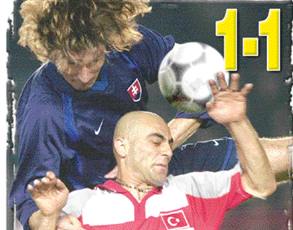 İkinci yarıya topu yere indirerek başladık. 54. dakikada Ergün'le duvar pası yapıp ceza alanına giren Fatih, Tomaschek'in sağ ayağının gölgesine takıldı. Evsahibi takımların uğurlu hakemi Wojcik tereddütsüz "Penaltı" dedi. Topla kaleciyi ayrı ayrı köşelere gönderen Hakan, milli formayla 30. golünü atarken, Slovakya da eleme grubunda kalesinde ilk golünü gördü: 1-0.
