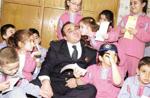 Minik öğrenciler kendilerine kırtasiye malzemesi dağıtan Beyoğlu İlçe Emniyet Müdürü Aykut Baltacı'yı öpücük yağmuruna tuttu..