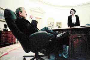Rice, bürokratlarla ilgilenmekle, Powell da Çin yönetimiyle bağlantıyı sürdürmekle görevlendirildi. Bush, Rice ve Powell' sayesinde günlük işlerini sürdürmüştü. Mektubun kaleme alınması sırasında da Baba Bush'a danışıldı. Baba Bush özür dilemenin yaratacağı sorunları oğluna anlattı. Mektup bu öğütler doğrultusunda yazıldı... Amerika dün de yeni bir EP-3 casus uçağın gelecek hafta Çin'e gönderileceğini ve göreve başlayacağını açıkladı.