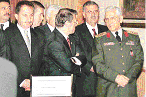 * Bir süre sohbet eden Cumhurbaşkanı Sezer ve Başbakan Ecevit daha sonra eşleri ile birlikte foto muhabirlerine poz verdi.