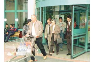 Cumhurbaşkanı Sezer takım elbiseli, Semra Hanım spor giysileriyle, arkalarında dört koruma görevlisi ile hipermarketi gezdiler, kendilerini ilgiyle izleyen vatandaşlara gülümseyerek karşılık verdiler.. Bol miktarda maden suyu, kola, sandviç ekmeği, içme suyu alan Sezer çifti, kasada da kuyrukta beklediler ve ödemeyi kredi kartıyla Cumhurbaşkanı yaptı.