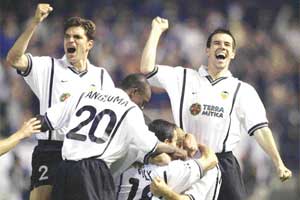 VALENCIA: Canizares 7- Angloma 8, Ayala 8, Pellegrino 7 Pablo Aurelio 6- Mendieta 8 (Dk.73 Angulo 7), Albelda 6, Aimar8 (Dk.70 Deschamps 6), Kily Gonzalez 7 (Dk.65 Vicente 6)- Carew 6, Juan Sanchez 9
