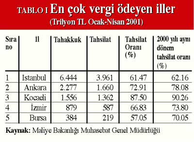 En çok vergi ödeyen 5 ilin, 2001 yılı ilk dört ayık vergi tahsilat oranına gözatıldığında, geçen yılın aynı döneminin gerisinde kaldığı farkediliyor. Bunların arasında, İstanbul'un tahsilat oranı hemen hemen geçen yılın aynısı. Buna karşılık, en yüksek orandaki gerileme yüzde 13 ile Bursa'da göze çarpıyor...