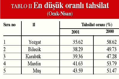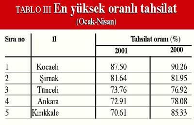 Tabloların incelenmesinden de farkedileceği gibi, ekonomik krizin vergi tahsilatı üzerindeki olumsuz etkisi, en yüksek oranlı tahsilat yapılan illerde bile hissediliyor.