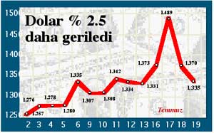 Enis Öksüz'ün istifası ile moral bulan piyasalarda Merkez Bankası'nın kurda etkinliğini hissettirmesi doların dün de yüzde 2.5 oranında gerilemesini sağladı. Gün içerisinde 1 milyon 350'leri gören dolar, krizinden sonra kesilen vadeli işlemler piyasasının ufak ufak açılmasının da etkisi ile geriledi. Merkez Bankası'nın dolar kapanış fiyatı 1 milyon 335 liradan gerçekleşti. Böylece salı gün 1 milyon 489 bin ile zirve noktaya ulaşan kurdaki düşüş iki günde yüzde 10'u aştı.