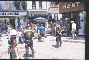 İstanbul'un en büyük alışveriş merkezlerinden biri olan Mahmutpaşa Caddesi'nin başında görev yapan özel güvenlik elemanları, giriş-çıkışları sürekli kontrol altınta tutuyor. Bir yandan şüphelendikleri şahısların çantalarını kontrol eden güvenlik elemanları, diğer yandan da kapkaça karşı sürekli tetikte bekliyor. Boş alanlara tezgah kuran işportacılara da müdahale eden güvenlik elemanları, gerçekleştirdikleri kontrollerle caddede alışverişi güvenli hale getiriyor. Şimdilik 7 kişiden oluşan güvenlik ekibinde görevli eleman sayısını artıracaklarını söyleyen Mahmutpaşa Esnaf Derneği yetkilileri, "Amacımız halkın güven ve huzur içinde alışveriş yapmasını sağlamak, sokakların korkulu rüyası olan kapkaççıları buradan uzuk tutmak. Aldığımız önlem sayesinde uzun süredir hiçbir kapkaç olayı gerçekleşmedi. Ucuzluk arayıp buraya gelenler korku duymadan alışveriş yapıp evine dönebiliyor. Güvenlik ekibimiz sayesinde işportacılar da çarşıya yaklaşamıyor" diyor.