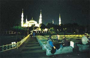 Geceleri ise tam bir cümbüş var. Çay bahçeleri meşalelerle donatılıyor ve müşterilerine kanun, ney ve tef eşliğinde canlı müzik sunuyor. Tam bir tatil havası esiyor; müşteriler el çırparak şarkılara eşlik ediyor. Ayrıca açık havada yapılan sema gösterileri de Sultanahmet'in mistik havasını iyice belirginleştiriyor. Bu gösteriler hem turistlerin, hem Müslümanlar'ın, hem de entelektüellerin yoğun ilgisini topluyor.