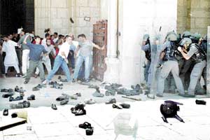 İbadet eden İsrailliler'in tahliye edilmesinin ardından, 400 polis El Aksa camisine giden Eski Kent'in kapılarından içeri girerek camilerin çevresini kuşattı. Camilerde bulunan Filistinliler, polise taş, sopa ve ayakkabılar fırlatmaya başladı. İsrail polisi de gözyaşartıcı bombalarla karşılık verdi. Filistinli din adamları da polisle göstericiler arasında canlı bir kalkan oluşturarak çatışmaları önlemeye çalıştı. Cami imamları da hoparlörlerle Filistinliler'i sakin olmaya çağırdı. Ancak bu çağrılar da işe yaramadı. Cami avlusuna girmek isteyen polisler, Filistinliler tarafından taşlarla püskürtüldü. Çatışmalar 5 saat sürdü.