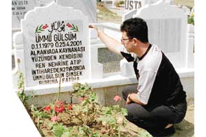 Fikrinaz ve Cemal Şimşek'in Almanya'ya gelin giden 15 aylık evli kızları Ümmü Gülsüm Tüzen (21), bir süre önce intihar etti. Genç kadın, Samsun Kıranköy Mezarlığı'na defnedildi. İntihardan kayınvalide Sehrat Tüzen'i sorumlu tutan Şimşek ailesi mezar taşına, "Almanya'da kaynanası yüzünden kendini Ren Nehri'ne atıp intihar eden Ümmü Gülsüm Şimşek" yazdırdı.