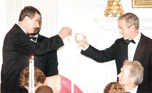 Gördüğü alkol tedavisinin ardından 15 yıldır ağzına içki koymayan Bush konuklara şarap ikram edilen gecede, Seven Up bardağıyla kadeh kaldırdı. İyi bir evsahipliği yapan First Leydi Laura Bush, mutfağa giderek hazırlanan yemekleri tek tek kontrol etti.