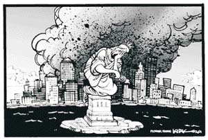 Karikatürcüler elbette "bir numaralı zanlı" ilan edilen Usame Bin Ladin'i de unutmadılar. Onu, mesela, iğrenç bir sıçana benzetenler çoktu.