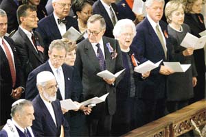 Katedraldeki törende ölenlerin ruhları için gitar çalındı, aryalar okundu. Toplu dua öncesi, Amerika'daki İslam Topluluğu Başkanı Muzammil Sıddık da kürsüye çıktı. Kuran-ı Kerim'den ayetler okuyan Sıddık, kısa süren konuşmasında "Bu saldırılar kalbimimiz kırdı. Gözlerimizi yaşarttı. Allah bize yardım etsin. Bütün farklı inançları ülkemizin iyiliği için birarada tutsun. Bizi kötülerden korusun" dedi. Onun ardından da Musevi dini temsilcisi bir konuşma yaptı. Daha sonra da katedralde ölenlerin ruhu için toplu dua edildi. Başkan Bush yaptığı konuşmada "Barışçı bir toplum olmamıza rağmen bize saldıran şeytan ile sonuna kadar savaşacağız. Bu kişi veya ülkelere cevap vermek tarihi görevimiz" dedi.