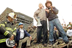 Kalabalık bir konvoyla New York'a giden ve helikopterle enkaz bölgesini gezen Bush, daha sonra Dünya Ticaret Merkezi önünde kurtarma çalışmalarına katılan gönüllülere teşekkür etti.