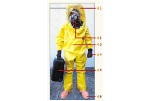 1- Kask: Zehirli maddenin solunum yoluyla girmesini engelliyor. İçinde oksijen sağlayan bir düzenek var.