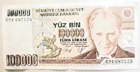 Bundan 10 yıl 11 Ekim 1991 tarihinde piyasaya çıkan kağıt 100 bin liranın bu günkü değeri yaklaşık 30 milyon liraya denk geliyordu. Çünkü o günün şartlarında 100 bin Türk Lirası ile 5 şişe 70'lik rakı alınabiliyordu ya da 15 paket TEKEL 2000.
