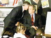 Beyaz Saray Genel Sekreteri Andrew Card, Bush'un kulağına eğilerek "Dünya Ticaret Merkezi'ne ikinci bir uçak çarptı" dediği an Başkan'ın yüzünde beliren ifade ertesi gün bütün gazetelerde yer aldı. Bush, o sırada hissettiklerini şöyle anlattı: