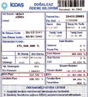 YukarIdaki faturadan BOTAŞ'ın kazandığı para 105 milyon 219 bin lira. İGDAŞ'ın payı 42 milyon 87 bin lira. Devletin vergi geliri ise 26 milyon 382 bin lira. Kaybeden ise tabii ki fatura sahibi... İstanbul'da 1 milyon 600 bin doğalgaz abonesinin bir yılda doğalgaza ödediği bedel 481 milyon doları buluyor. Bunun 292 milyon dolarını İGDAŞ, gaz bedeli olarak BOTAŞ'a veriyor. Yüzde 39 kâr payı alan İGDAŞ'ın payına düşen miktar ise 116 milyon dolar. Geriye kalan 73 milyon dolar da Maliye'nin kasasına KDV bedeli olarak giriyor.