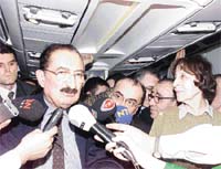 Uçak hareket etmeden önce heyetteki herkesin tek tek elini sıkarak "İyi yolculuklar" dileyen Ecevit, yolculuğun yaklaşık dördüncü saatinde de basın mensuplarının yanına geldi ve sorularını yanıtladı. Ecevit'e yöneltilen sorular ve cevapları şöyle: